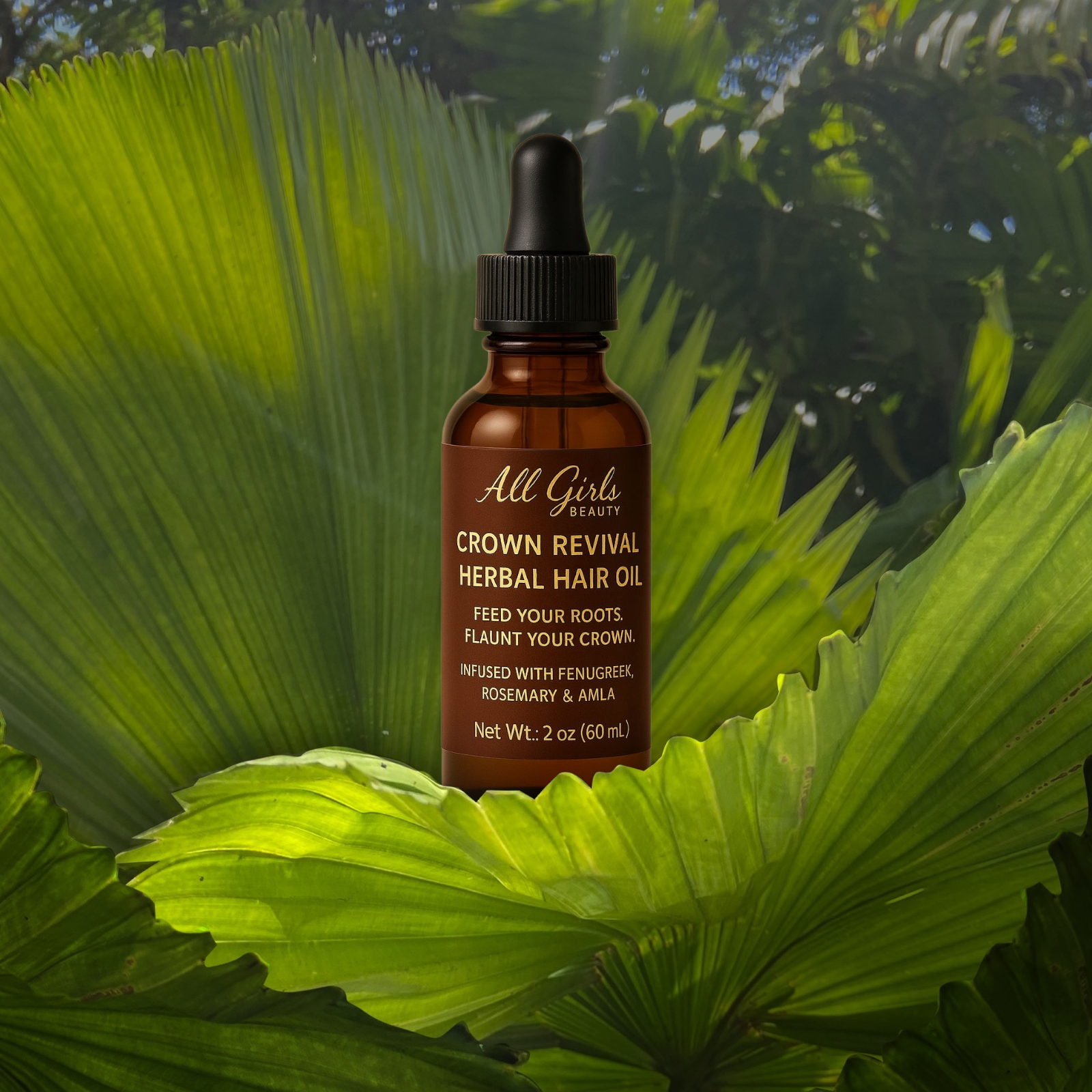 Unlock the secret to fuller, healthier, and more radiant hair with Crown Revival Herbal Hair Oil by All Girls Beauty. Expertly crafted with time-tested Ayurvedic herbs, this nourishing formula is infused for 90 days with Fenugreek, Rosemary, Amla, Chebe, Neem, Nettle and other powerful botanicals known to support hair growth and scalp health.